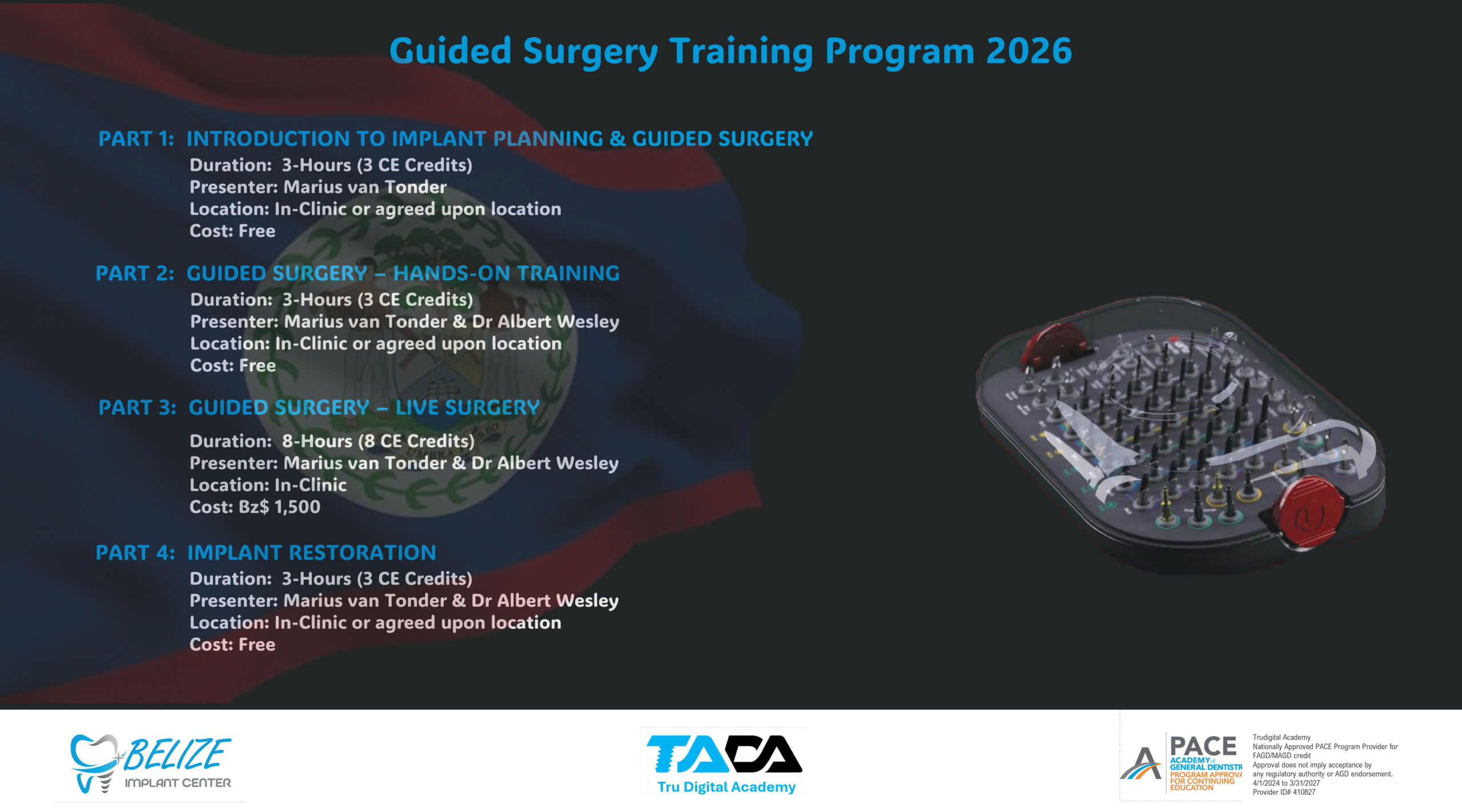 2) support the Dental Specialists and General Dentists of Belize by making implant fixtures, surgical instruments and restorative components accessible to them via our online store for delivery to their clinic,