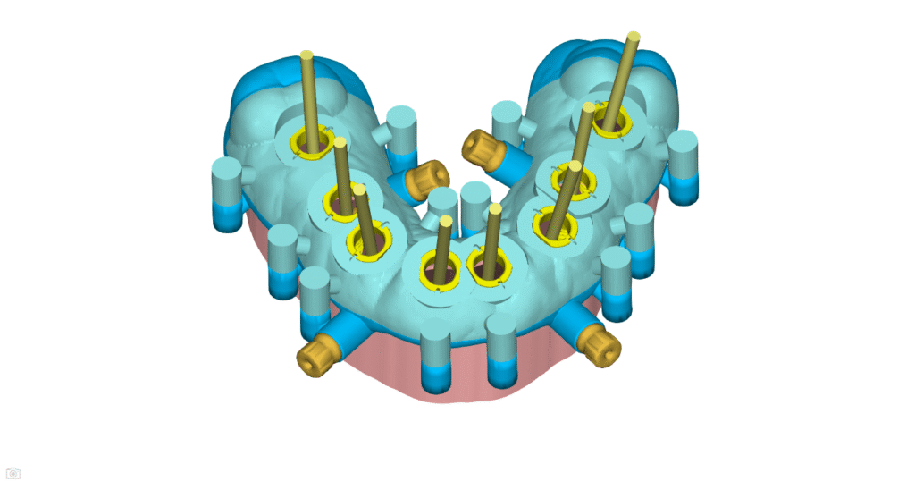These guides are used for full-arch FP1 and FP3 cases and can be gingiva-supported or bone-supported.  These cases are complex and typically performed by Dental Specialists.  We use JB Dental Lab in the USA for the design and manufacture of the final prosthesis, but we can manufacture the temporary prosthesis locally.  Feel free to use your preferred lab.